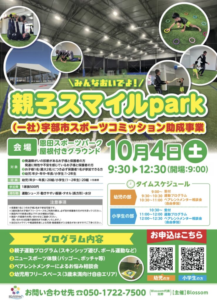 このたび、宇部市スポーツコミッション助成事業として、Blossom主催の「親子スマイルpark」を開催いたします。